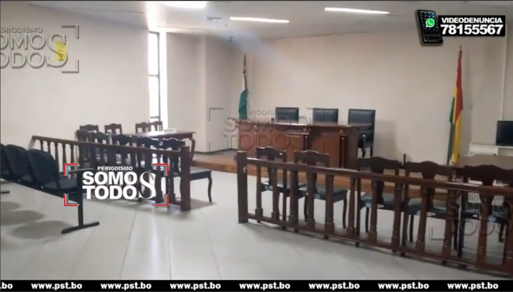 Luego de que la justicia determinara que el Gobernador de Santa Cruz Luis Fernando Camacho Vaca, no sea trasladado al departamento por ser “ PERSONA NO GRATA EN PALMASOLA ”, así quedó la sala de Audiencia tribunal 8ºde sentencia penal, donde se iba a llevar acabo la audiencia del gobernador.