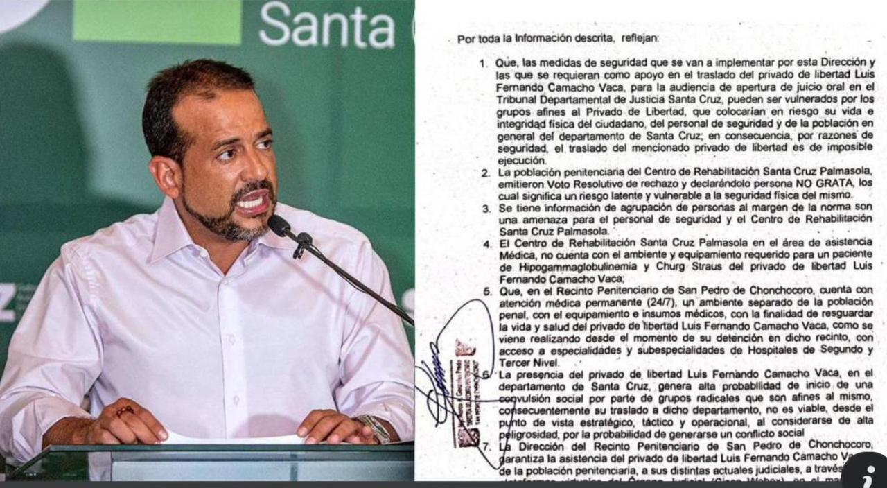 Luego de que se diera a conocer que no sería trasladado hasta a el departamento de Santa Cruz el gobernador Luis Fernando Camacho estos son los puntos por lo cual no fue trasladado para que se lleve acabo la audiencia: