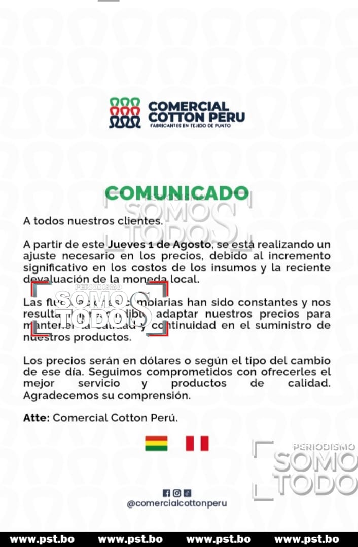 El anuncio es de la empresa Comercial Cotton Perú, a través de un comunicado advierten al mercado nacional que la situación comercial con Bolivia es insostenible, por lo cual ajustarán sus precios a la fluctuación del dólar, esto para garantizar su calidad de productos, el ajuste se hará efectivo desde el uno de Agosto.