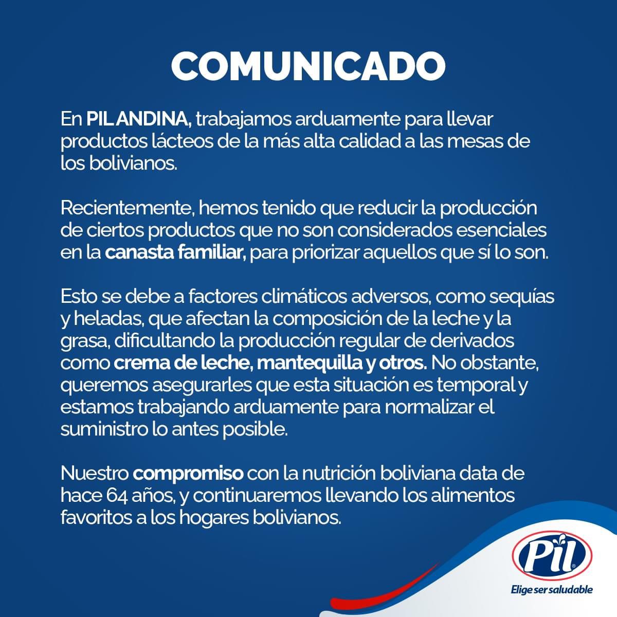 A través de un comunicado, una de las industrias lecheras más grandes del país explica a sus clientes porque no hay disponibilidad de mantequilla y crema de leche, productos no esenciales para la canasta familiar, aseguran que la sequía ha afectado la calidad grasa de la leche lo que estas dificultando la producción, sin embargo, añaden que la escasez es temporal.