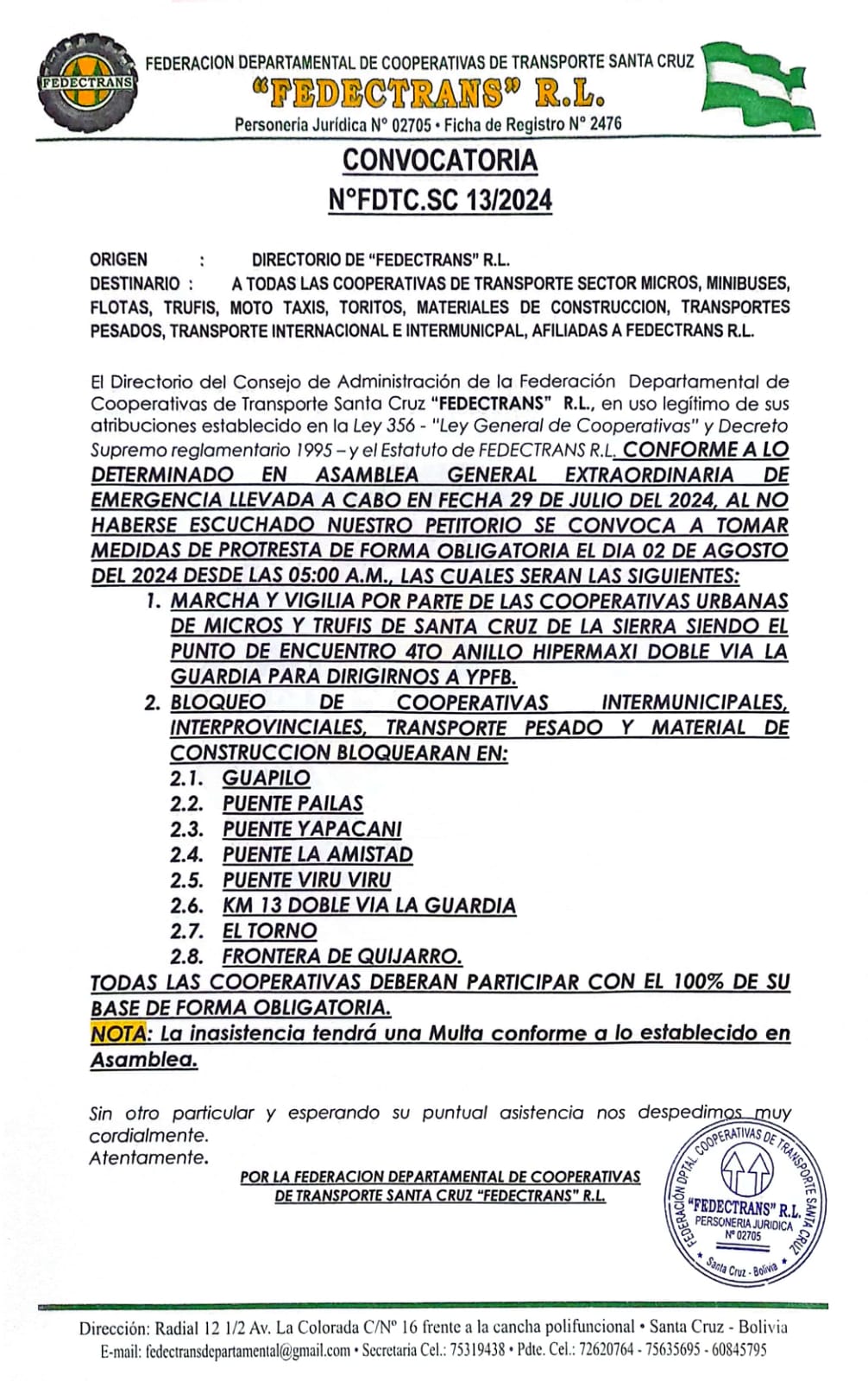 El sector aglutinando en FEDECTRANS, saldrá a las calles en una masiva marcha, mientras que en provincias, los transportistas pesados de áridos, bloquearan puentes y carreteras del departamento de Santa Cruz, la medida se da luego de que el gobierno suscribirá un convenio con el transporte pesado, bajo la advertencia del Ministro de Gobierno de usar la fuerza para desbloquear.