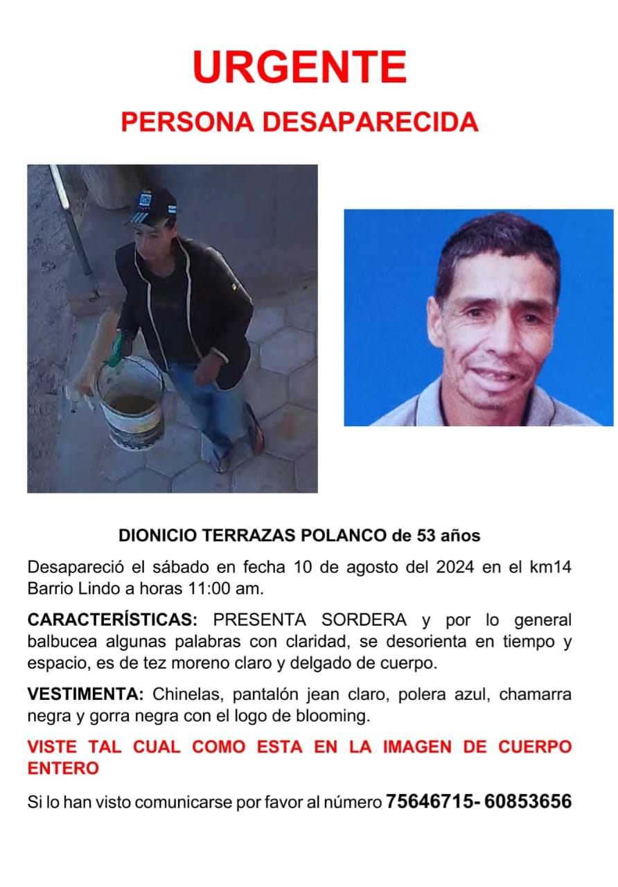 Desapareció el sábado en fecha 10 de agosto del 2024 en el km14