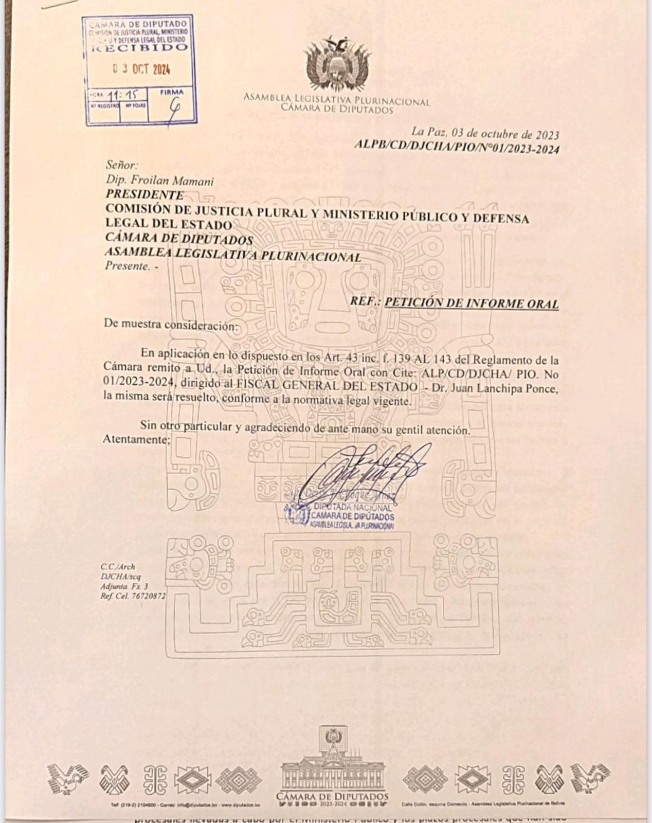 POLÍTICA CITAN AL FISCAL GENERAL JUAN LANCHIPA A LA ASAMBLEA PLURINACIONAL Published 1 año ago on 03/10/2024 By Emilio Ramirez Cámara de diputados cita a la Asamblea Plurinacional al fiscal general Juan Lanchipa, para que brinde un informe oral sobre el proceso en contra de Evo Morales. Comparte esto: Haz clic para compartir en WhatsApp (Se abre en una ventana nueva) WhatsApp Haz clic para compartir en Facebook (Se abre en una ventana nueva) Facebook Haz clic para compartir en X (Se abre en una ventana nueva) X Haz clic para enviar un enlace por correo electrónico a un amigo (Se abre en una ventana nueva) Correo electrónico Haz clic para compartir en Telegram (Se abre en una ventana nueva) Telegram Related Topics:BOLIVIACASOEVO MORALESJUAN LANCHIPA Up Next MORALES DENUNCIA UN OPERATIVO DEL GOBIERNO PARA DETENERLO Y SACARLO DEL PAÍS EN HELICÓPTERO Don't Miss JUEZ PIDE EN PLENA AUDIENCIA GARANTÍAS, DENUNCIÓ QUE ES AMEDRENTADA Emilio Ramirez Continue Reading Advertisement You may like MINISTERIO DE SALUD DESTITUYE A DOS FUNCIONARIAS POR SUPUESTOS ACTOS DE CORRUPCIÓN UCS CONSIGUE APOYO DEL MAS PARA QUE JHONNY FERNÁNDEZ SIGA EJERCIENDO DESDE PALMASOLA DE VÍCTIMA A VICTIMARIA: DENUNCIAN PRESUNTO TRÁFICO DE INFLUENCIAS TRAS AGRESIÓN EN CIUDAD SATÉLITE “FALLAS INUSUALES” EN EL AVIÓN PRESIDENCIAL RETRASAN VIAJE DE RODRIGO PAZ A MIAMI MINISTRO MEDINACELI AFIRMA QUE DORGATHEN FUE ALERTADO EN 2025 SOBRE PROBLEMAS EN LA GASOLINA SANTA CRUZ DEMANDA 2,8 MILLONES DE LITROS DE GASOLINA; YPFB ANUNCIA DESPACHO DE 2 MILLONES Click to comment Leave a Reply Cancelar la respuestaTu dirección de correo electrónico no será publicada. Los campos obligatorios están marcados con *Comentario * Nombre Correo electrónico Web Guarda mi nombre, correo electrónico y web en este navegador para la próxima vez que comente.
