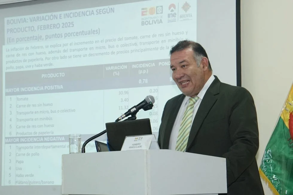 El Instituto Nacional de Estadística (INE) reveló que, hasta febrero de 2025, los mayores aumentos de precios se registraron en productos esenciales como carne, tomate y transporte. A pesar de este incremento, el director del INE, Humberto Arandia, informó que la inflación de febrero disminuyó al 1,26%, un alivio frente al 1,95% de enero.