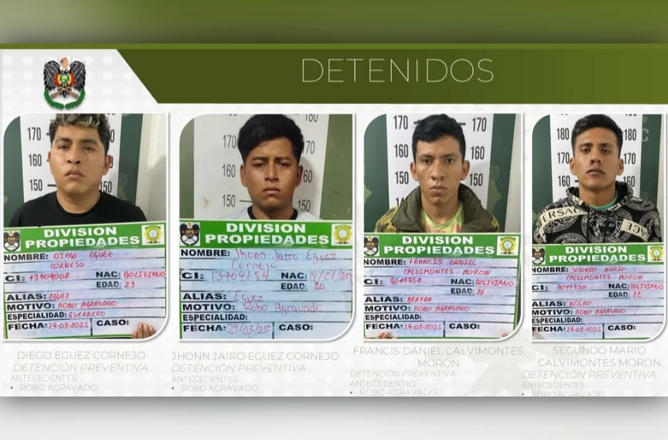 Una banda criminal que sembraba el terror en micros y minibuses de la ciudad fue desarticulada por la División Propiedades de la Fuerza Especial de Lucha Contra el Crimen (FELCC). Los delincuentes se dedicaban al robo de celulares y atacaban brutalmente a sus víctimas con estiletes, causándoles heridas en el rostro.