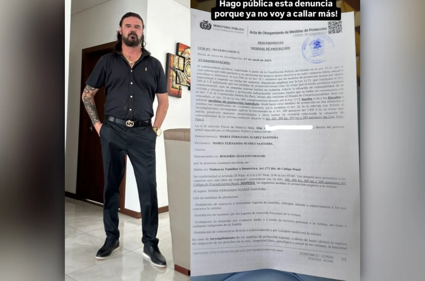 El Ministerio Público emitió el 27 de abril de 2025 un acta de medidas de protección a favor de Suárez, como parte de una investigación por el delito de violencia familiar o doméstica, tipificado en el artículo 272 Bis del Código Penal boliviano.