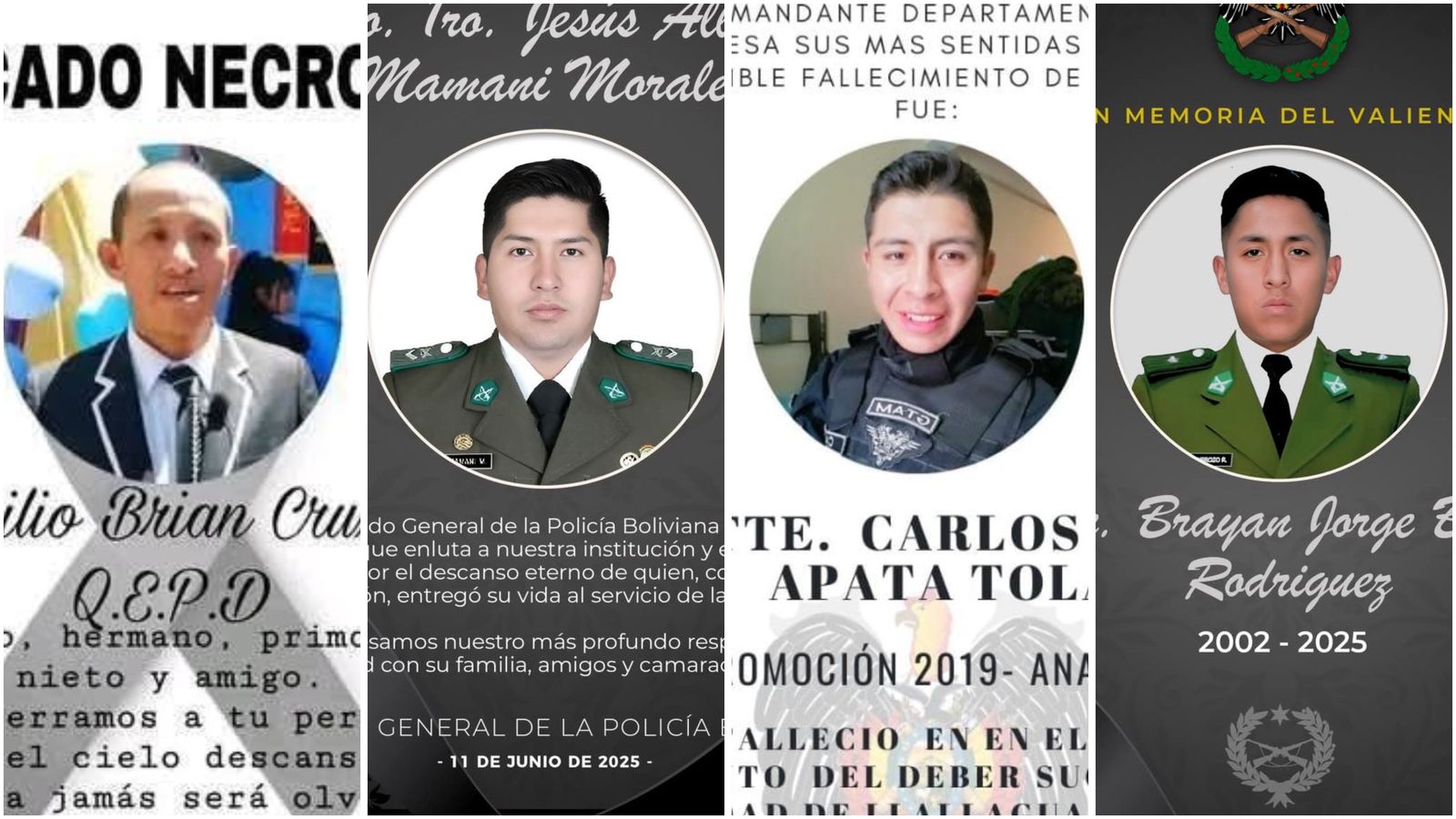 Los tres primeros uniformados perdieron la vida en una emboscada en Llallagua, Potosí, cuando grupos de bloqueadores atacaron al contingente policial que intentaba restablecer el paso. En ese hecho murieron los subtenientes Carlos Enrique Apata Tola y Brayan Jorge Barrozo Rodríguez, además del sargento segundo Jesús Alberto Mamani Morales.