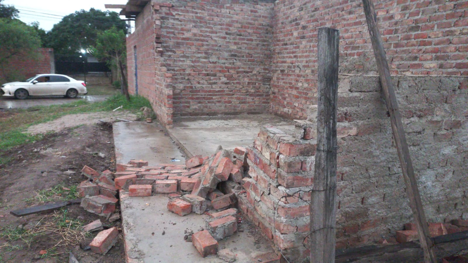 El impacto fue tan fuerte que la pared del inmueble colapsó, causando destrozos considerables dentro de uno de los cuartos. El automóvil quedó completamente destruido en la parte frontal y el delincuente, malherido.