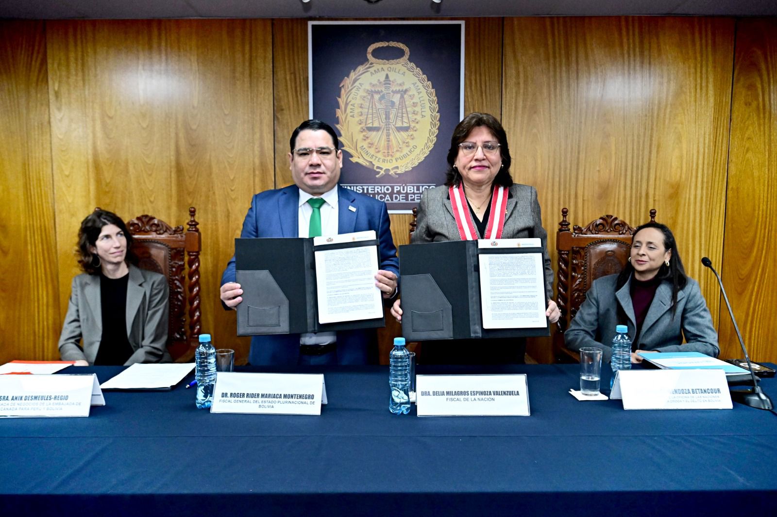 El Fiscal General del Estado Plurinacional de Bolivia, Roger Mariaca Montenegro, y la Fiscal de la Nación del Perú, Delia Espinoza Valenzuela, suscribieron hoy un Acuerdo de Cooperación Interinstitucional con el propósito de fortalecer la coordinación y el trabajo conjunto entre ambos países en la lucha frontal contra el crimen organizado transnacional.