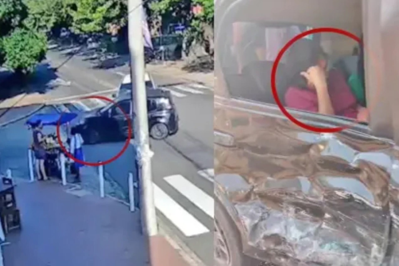 Cámaras de seguridad captaron el momento exacto del accidente, cuando la vagoneta blanca sorprendió al vehículo negro mientras cruzaba la intersección, provocando que este se descontrolara y terminara colisionando contra el puesto.