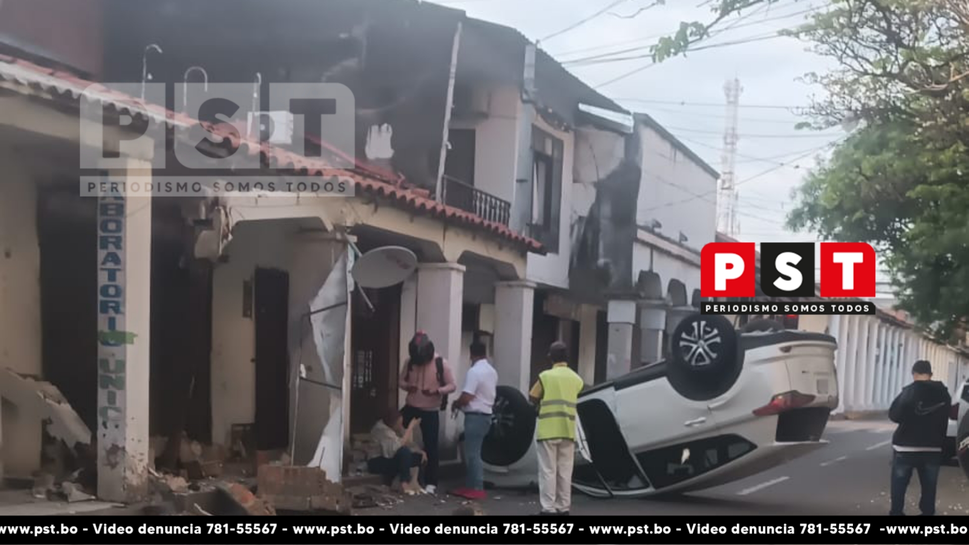 AUTO SE ESTRELLA CONTRA UNA CASA, QUEDA VOLCADO Y DEJA HERIDOS EN PLENO CENTRO CRUCEÑO