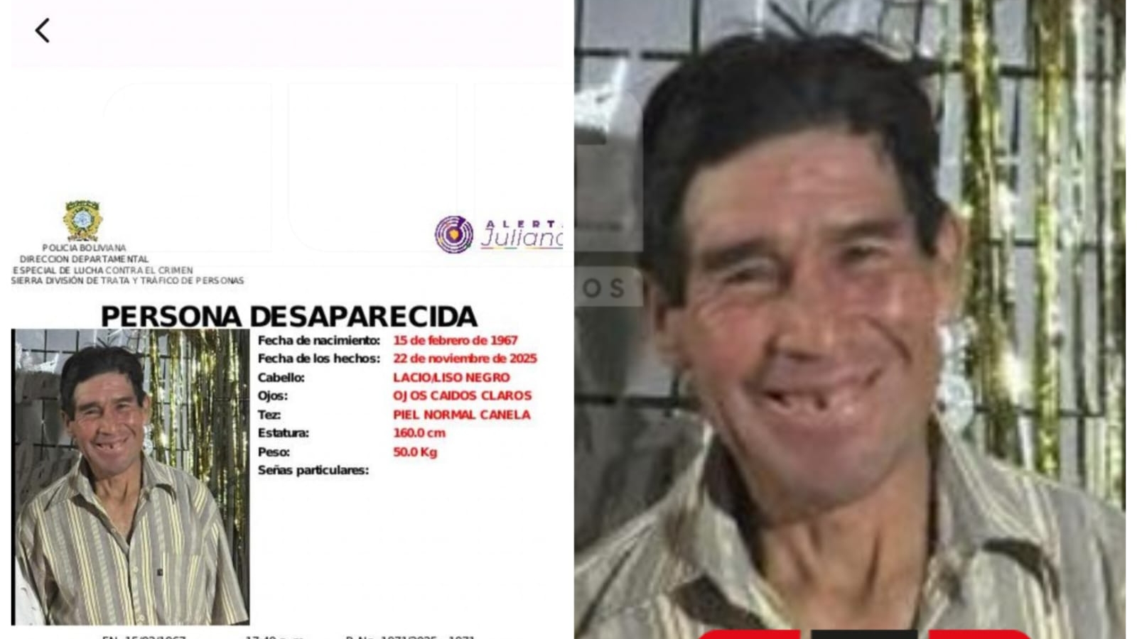 La familia informó que el hombre vestía una camisa celeste, pantalón azul y bocacines al momento de salir de su vivienda. Sus características físicas también fueron detalladas para facilitar su identificación: mide aproximadamente 1.60 metros, pesa alrededor de 50 kilogramos, tiene el cabello lacio de color negro, ojos claros y tez canela. Desde su desaparición, sus allegados viven momentos de profunda preocupación y angustia, por lo que piden a la población colaborar con cualquier dato que pueda contribuir a ubicarlo.