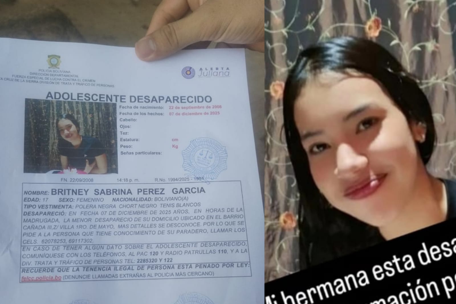 La Fuerza Especial de Lucha contra el Crimen (FELCC) de Santa Cruz activó la alerta para localizar a Britney Sabrina Pérez García, adolescente de 17 años, desaparecida la madrugada del 7 de diciembre de 2025 en el barrio Cañada III, zona Villa 1ro de Mayo. Desde entonces, su familia no tiene noticias sobre su paradero y pide la colaboración de la población.