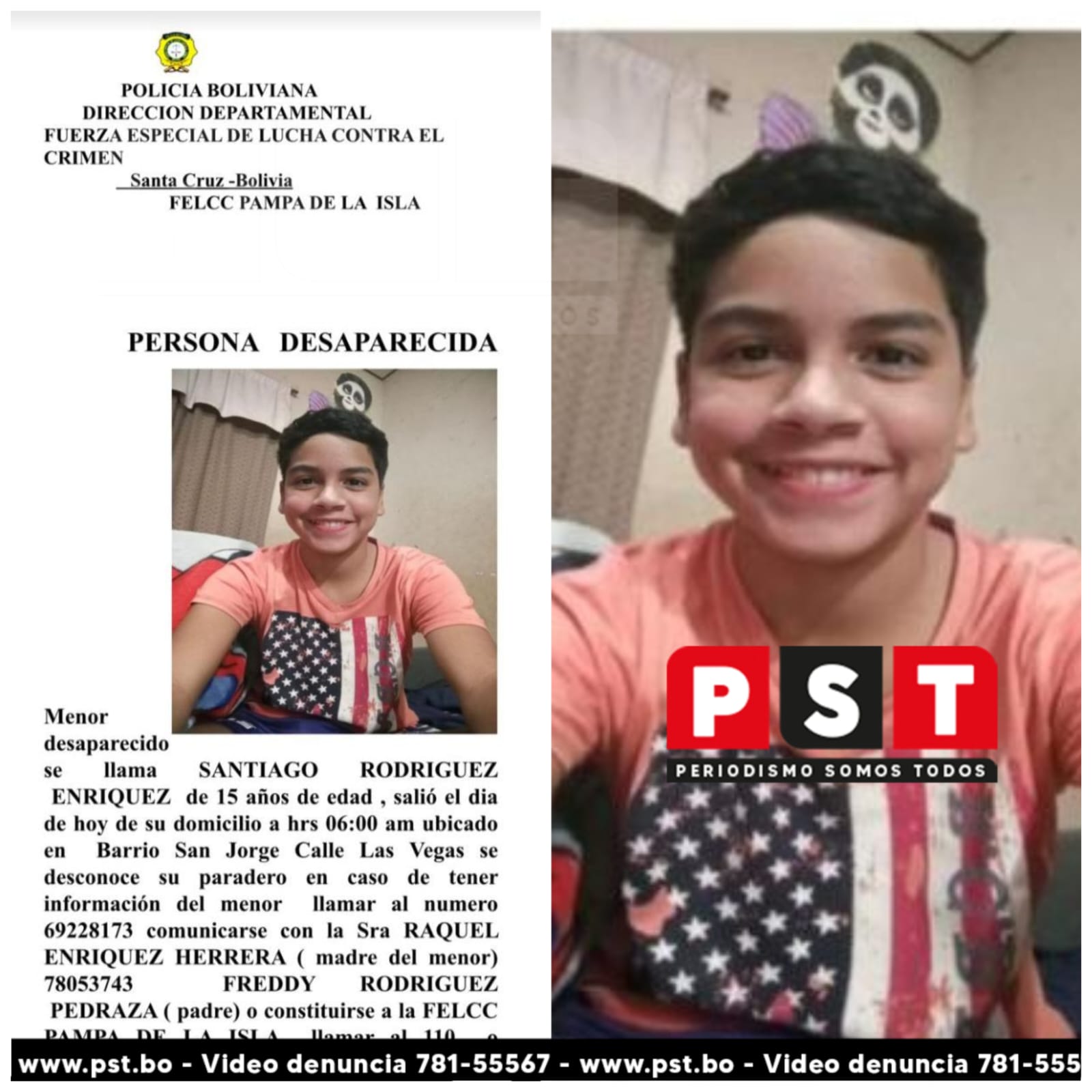 La Fuerza Especial de Lucha Contra el Crimen (FELCC) activó un operativo de búsqueda tras la desaparición del adolescente Santiago Rodríguez Enríquez, de 15 años de edad, quien salió de su domicilio la mañana del martes alrededor de las 06:00 y desde entonces no se tiene información sobre su paradero.